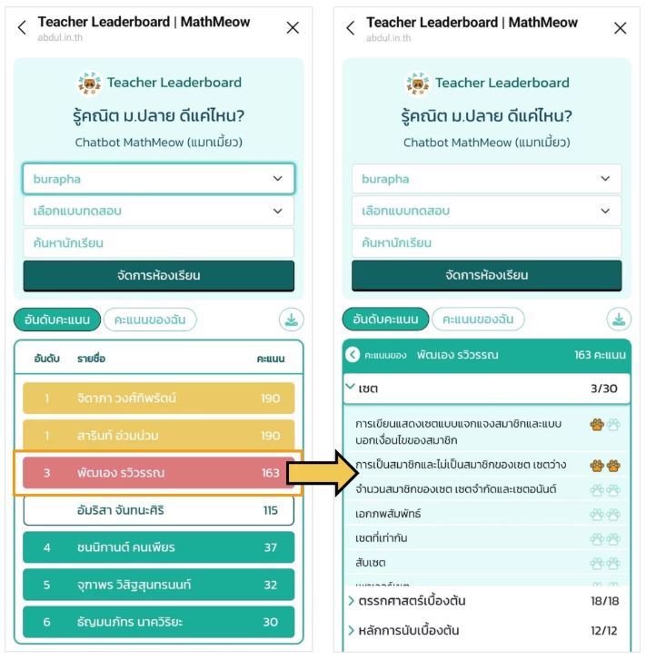 - คุณครูสามารถคลิกที่ชื่อของนักเรียนแต่ละคนเพื่อดูคะแนนรายหัวข้อย่อยของนักเรียน